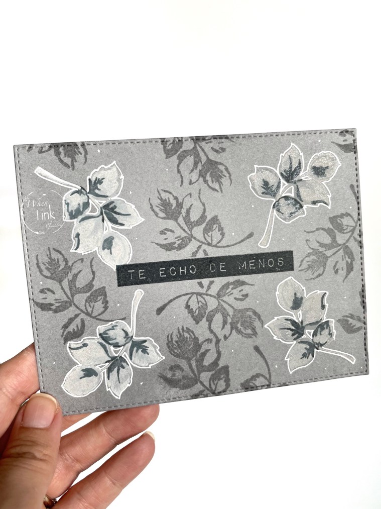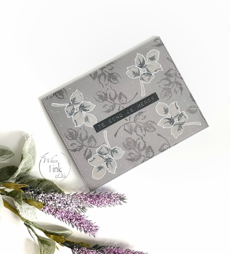 I began with a A2 sized stitched frame die cut in gray. I first stamped the foliage base (found in the vintage roses stamp set) in each corner using pumice stone color. The second layer stamp (found in the add-on set) followed with hickory smoke, and for the third layer detail I used black soot. I stamped “Te echo de menos” (I miss you) sentiment from the Label Love Spanish stamp set, in black dye ink. I then used the second layer foliage stamp to add watermark detail in clear embossing ink. Once ink was fully dry, I used a white gel pen to trace around the foliage in the corners and to add small dots throughout the card. I also used a shimmer pen to add a little shine to the gray leaves. I attached it to the card base using strong double sided tape.