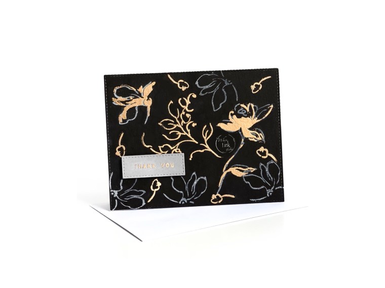 Usually when working on cards, I die cut many different colors to have on hand for later use. I will typically grab a color and see where my creativity takes me. I chose black, gray and gold for a different spin. I started with black card stock which I die cut using a A2 sized stitched frame. I chose a gray pigment ink for my first layer, and for my second layer I prepped my card stock by using an anti-static pouch. I used a clear embossing ink and embossing powder in gold. I did each of the larger flowers one at a time to avoid any extra powder from sticking to my background. I chose the “Thank You” sentiment from my vintage roses add-on stamp set and placed it on a gray sentiment strip. I used clear double-sided tape to adhere to my base card.