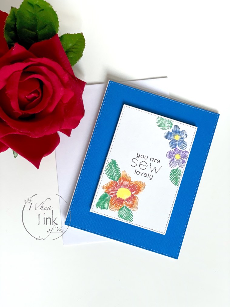 I began with a stitched die cut base in white (cut to about 2.75in by 4in). I chose distressed oxide inks in candied apple, squeezed lemon, spiced marmalade, mowed lawn, prized ribbon, and seedless preserves. I began with the center of the larger flower and worked my way outward. I repeated the process for the smaller flowers by beginning with the flower center and working outward. I added foliage by using masking sheets to prevent covering any portion of the flower itself. I used the sentiment “you are sew lovely” included with the Embroidered Blooms stamp set. I then added my centerpiece to a bright blue A2 sized background using foam tape to add a bit of dimension, and attached that to a white card.