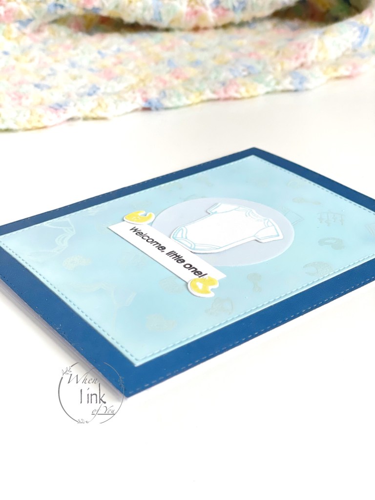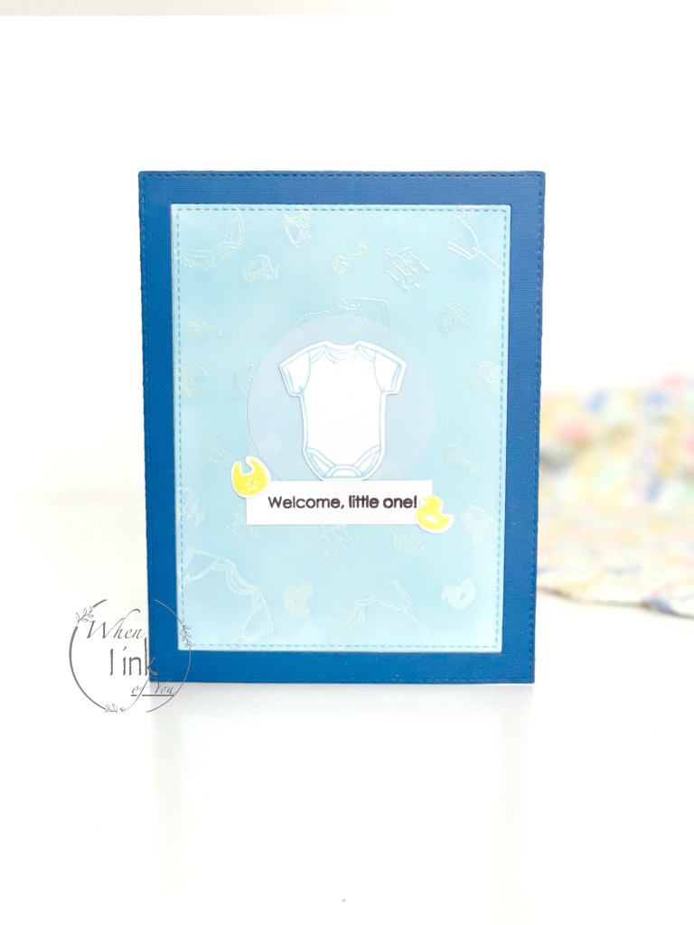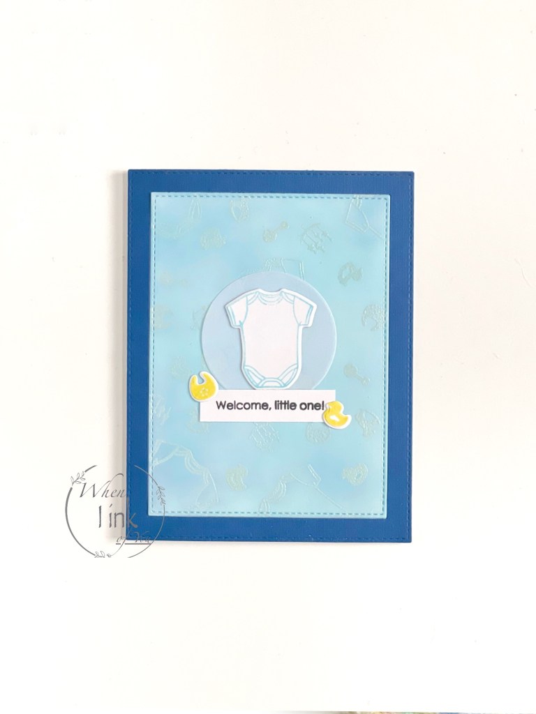 I placed a onesie die-cut stamped in blue and centered it to a white vellum circle. Next, I added the sentiment on a white strip and attached two die cuts in yellow for a pop of color. Finally, I die-cut navy cardstock with a frame in the center to fit my piece for a simple inlay.