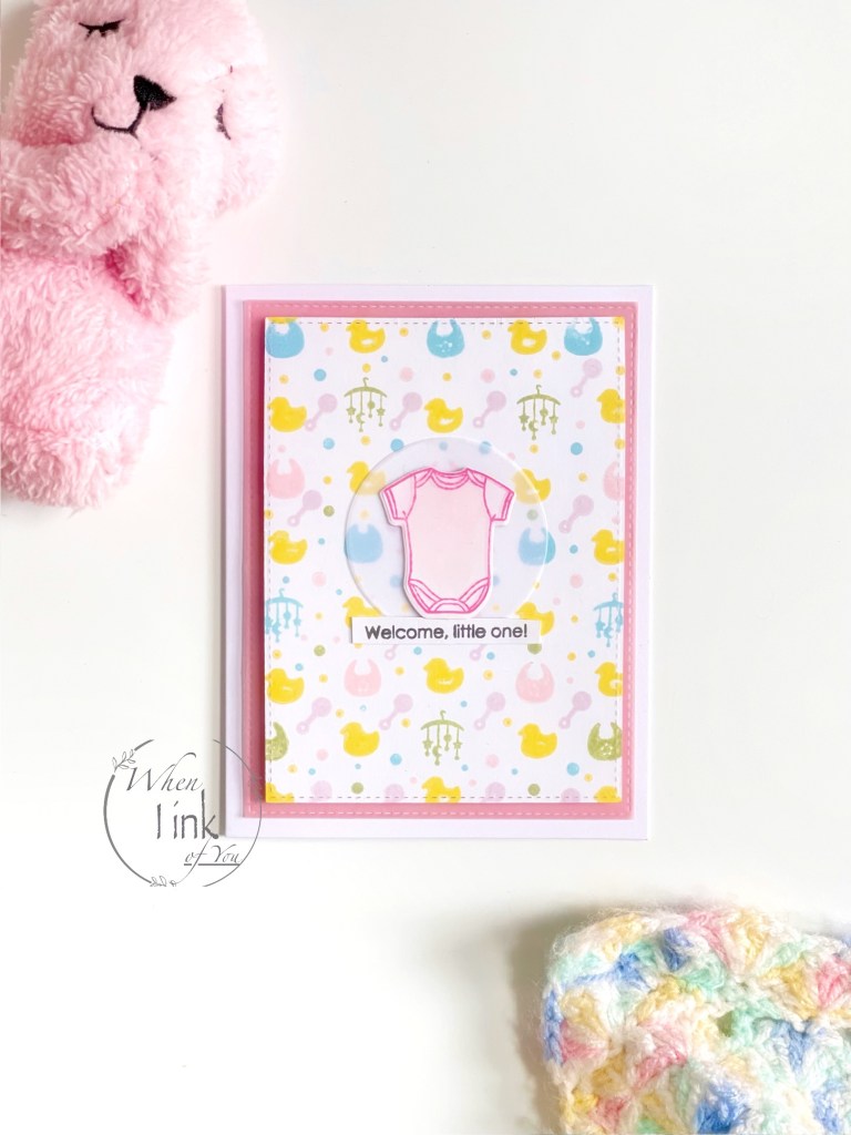 I created this card by simply stamping shapes at random to create a patterned paper look. I lightly shaded a die-cut set aside from card one and stamped the onesie outline in picked raspberries ink. I used double-sided tape to attach the cut to a small vellum circle and centered it onto my background. Next, I stamped “Welcome, little one!” onto white card stock and cut it into a small strip. I placed it at the bottom with double-sided tape.