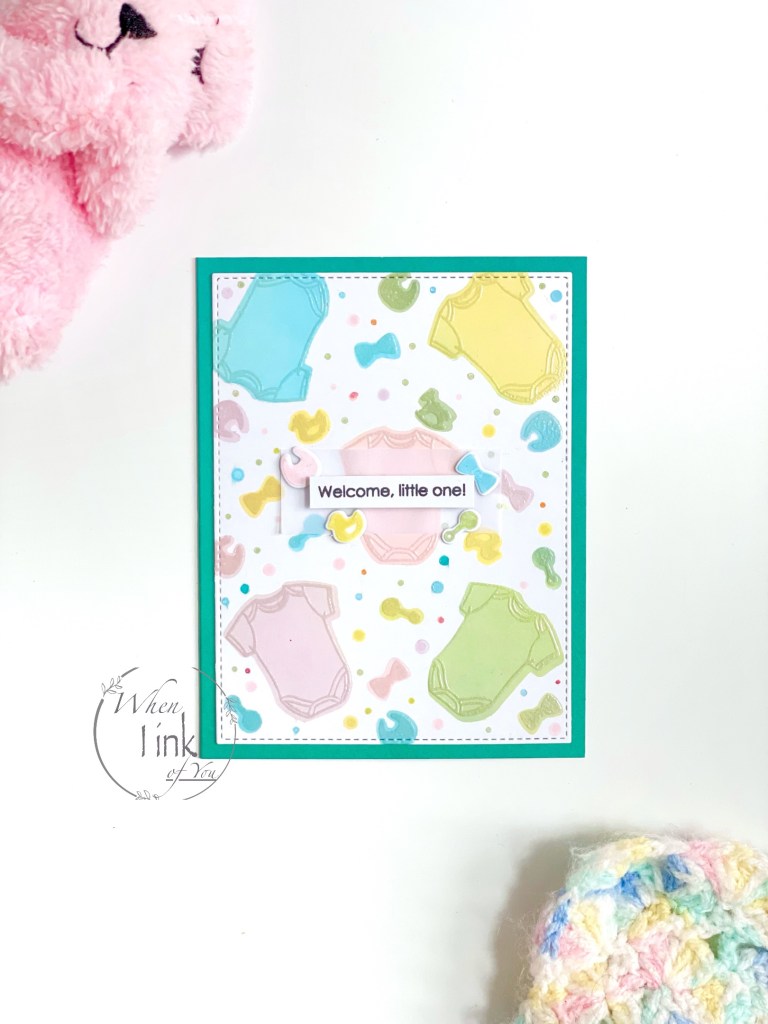 I began by creating a stencil with the onesie-shaped die. Next, I made five cuts in different directions and created smaller stencils with the rest of the shapes in this set. I then blended ink using the onesie stencil first and followed with the smaller shapes at random. Next, I let the ink dry and then prepared the surface with anti-static powder. Next, I stamped the images with clear embossing ink, poured white pearl embossing powder, and heat set it. Finally, I added various dots using the dot stamps included in this set.