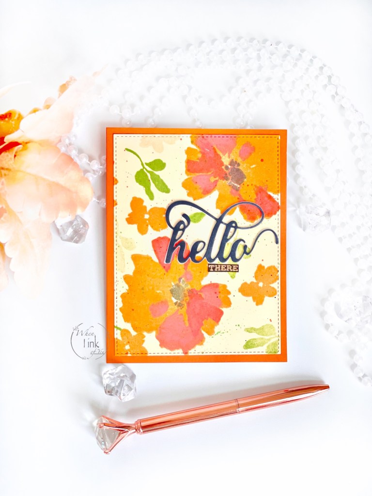 I chose Altenew’s Watercolor Wonders Stamp Set and distress oxide inks in Carved Pumpkin, Abandoned Coral, and Crackling Campfire for this project. I also used a light yellow colored card stock as the card base.