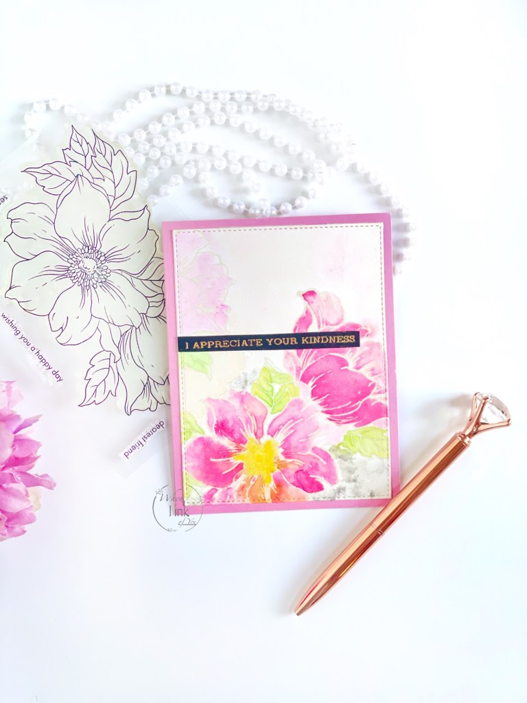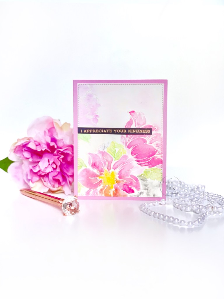 I placed the die cut with pink florals onto a pink notecard using double-sided tape. I added a sentiment strip I previously made during “in the mood for color.” The sentiment reads, “I appreciate your kindness.” I created it with black card stock, gold embossing powder, and Altenew’s Sentiment Strips 2 Stamp Set.