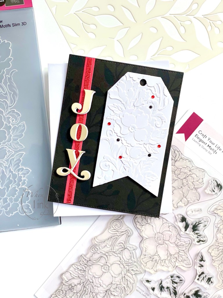 I began by using Altenew’s Slim Botanical 3D Embossing Folder and white card stock. Next, I cut my embossed paper with a tag shape from Altenew’s Terrific tags. Next, I added black foam tape to the back and set it aside. I then taped Altenew’s Leaves and Berries Stencil onto black card stock and blended watermark ink over the stencil. Once dry, I attached the embossed tag onto the right side of the black card stock. Next, I cut red and red glitter card stock into strips and used double-sided tape to attach them to the card. Next, I cut “Joy” in matte gold foil card stock and used foam tape to attach the letter over the red strips.