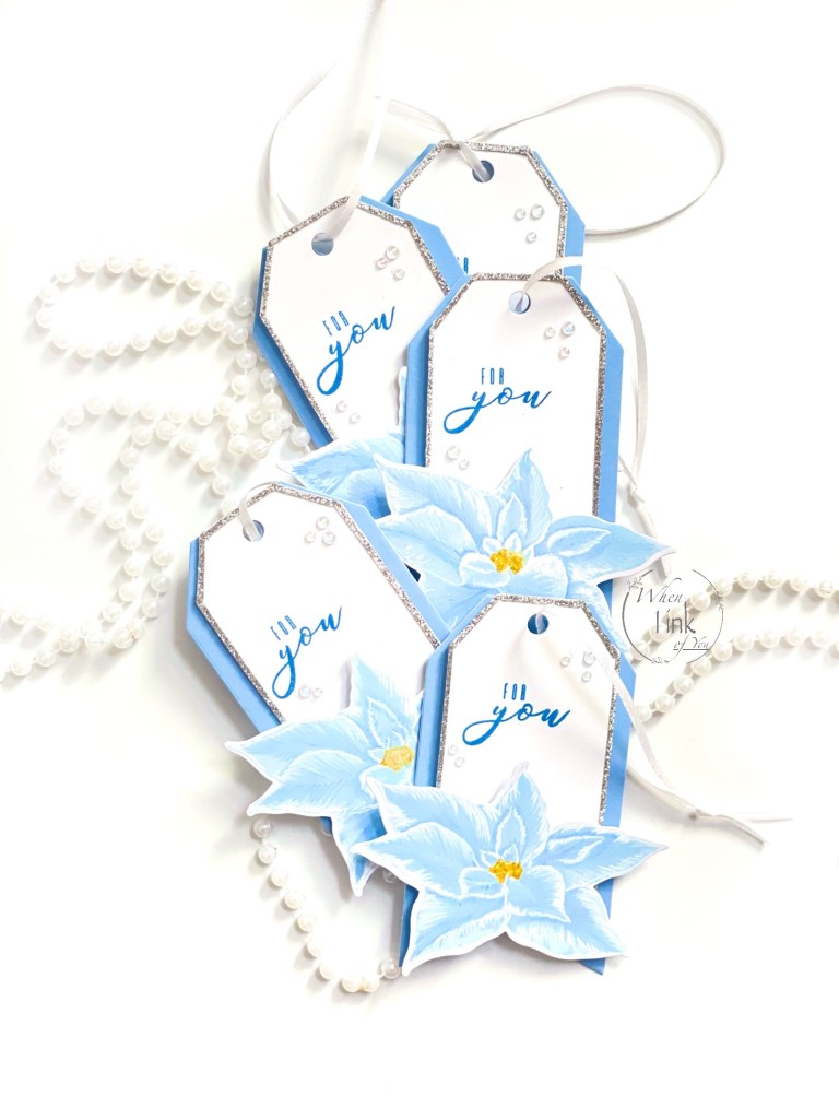 I cut tag shapes with Altenew’s Terrific Tags Die Set. I used blue card stock for the larger portion and white for the smaller. I stamped “For You” included with the poinsettia stamp set in summer sky. I cut thin silver glitter card stock strips and used them to border the white tag. I then attached the white tag to the blue with foam tape. I attached the poinsettia with double-sided tape and foam tape where needed. For a final touch of sparkle, I added iridescent beads. Finally, I added a white satin ribbon to hang my tags onto wrapped gifts.