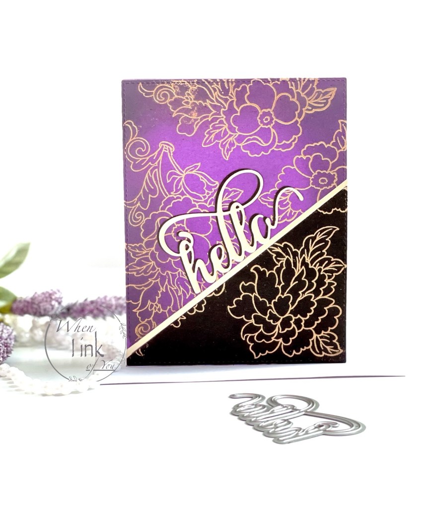 I cut a small portion of my full-color flower at an angle. Next, I aligned it with the white flower and attached it with foam tape. Next, I die cut “hello” using Altenew’s Fancy Hello Die once in matte gold and twice in white, then stacked them with liquid glue. Next, I cut a thin strip in the same matte gold and adhered it near the right edge with double-sided tape. To finish, I added this piece to a purple notecard.