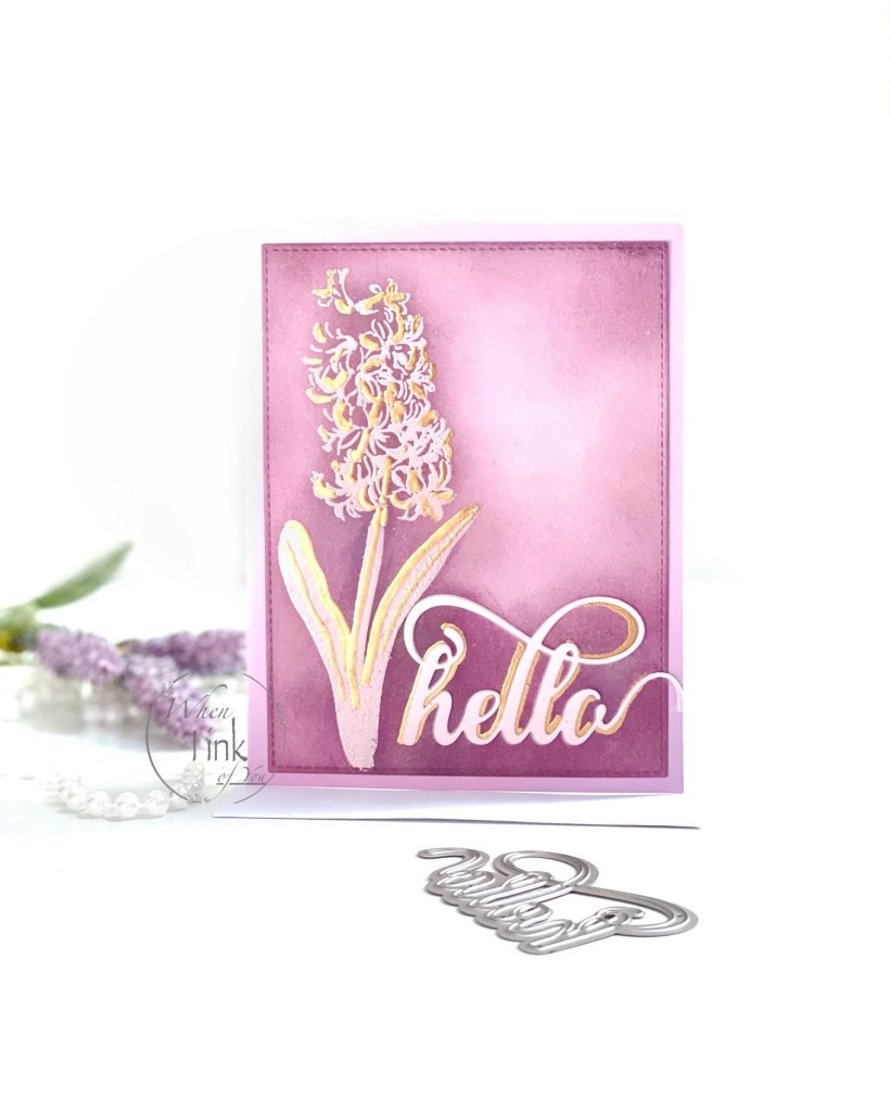 I blended Crisp Dye ink in Plum around the edges and the lower right side of my project. Next, I cut “hello‘ and used one die cut as a mask to blend the ink. Once the blending was complete, I used the clear embossing in pen to outline “hello,” and heat set it in gold powder. I next attached a stacked hello with liquid glue.
