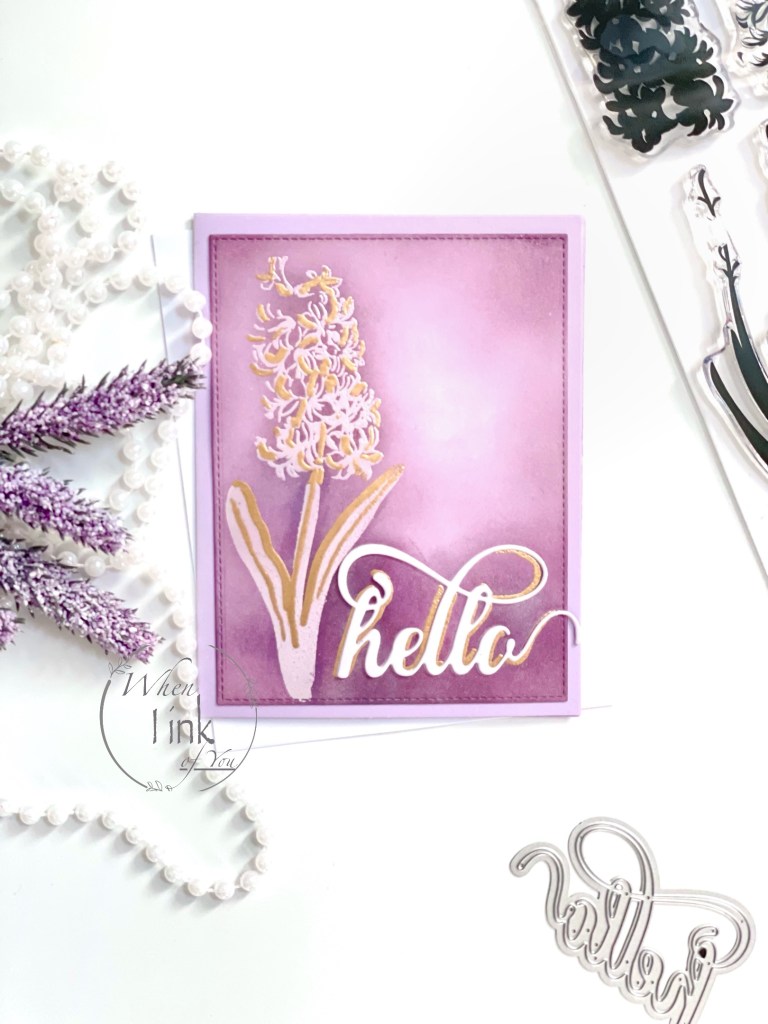 I chose to use Altenew’s Build-A-Flower Hyacinth Layering Stamp Set for this card. I first stamped the detail layer stamps onto lilac-colored card stock in white embossing powder and set it aside. Then, I began to layer the flower on white card stock using Altenew’s SugarPlums Crisp Dye Ink Set. I used Pale Mauve, Amethyst, and Grape Agate. Finally, I used Momento dew drop ink for the foliage and stem in new sprout and cottage ivy.