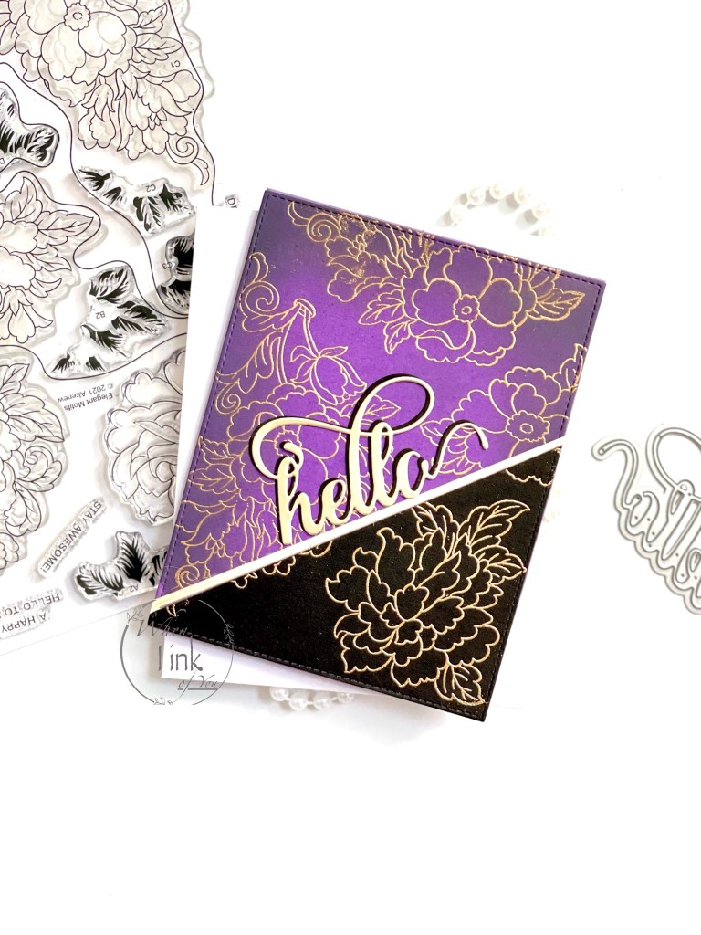 I created card three by prepping purple and black card stocks with anti-static powder. Then, using my Misti stamping tool, I arranged stamps from Altenew’s Elegant Motifs Stamp Set and pressed them onto both card stocks in clear embossing ink. I then poured gold embossing powder and heat set it. Next, I cut the card stocks together at an angle. I chose two of the cuts, aligned them, and used Washi tape to secure them together at the back of the paper. Next, I cut a thin strip of matte gold card stock and adhered it to the diagonal cut. Finally, I added “hello” in matte gold with a black cut offset behind it and placed it alongside the strip.