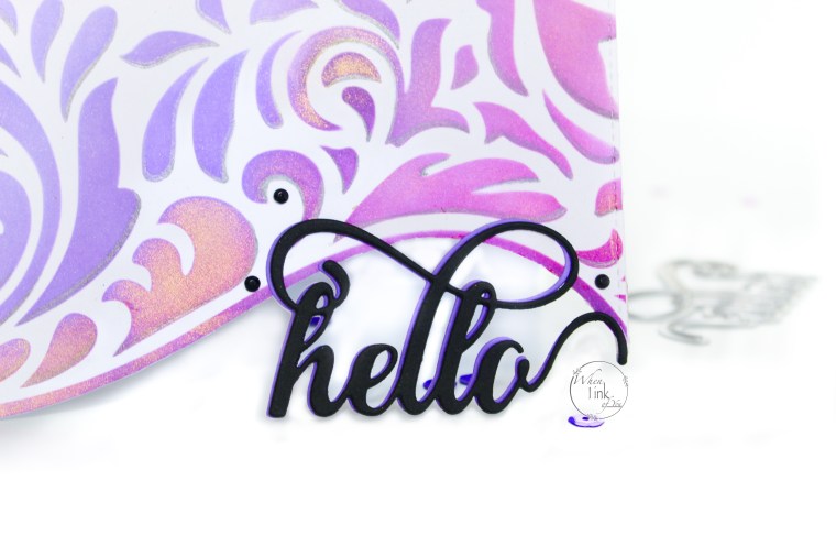 I cut along the large curve of the stenciled image and out of a white notecard. Next, I die-cut “Hello” in black, purple, and white using Altenew’s Fancy Hello Die. For a seamless look on the inside, I glued the white “Hello” on top of the notecard first and then added the inked panel. Next, I added the purple hello directly to the white and offset the stacked black hellos. Finally, I added three black gems in a triangular pattern for sparkle.