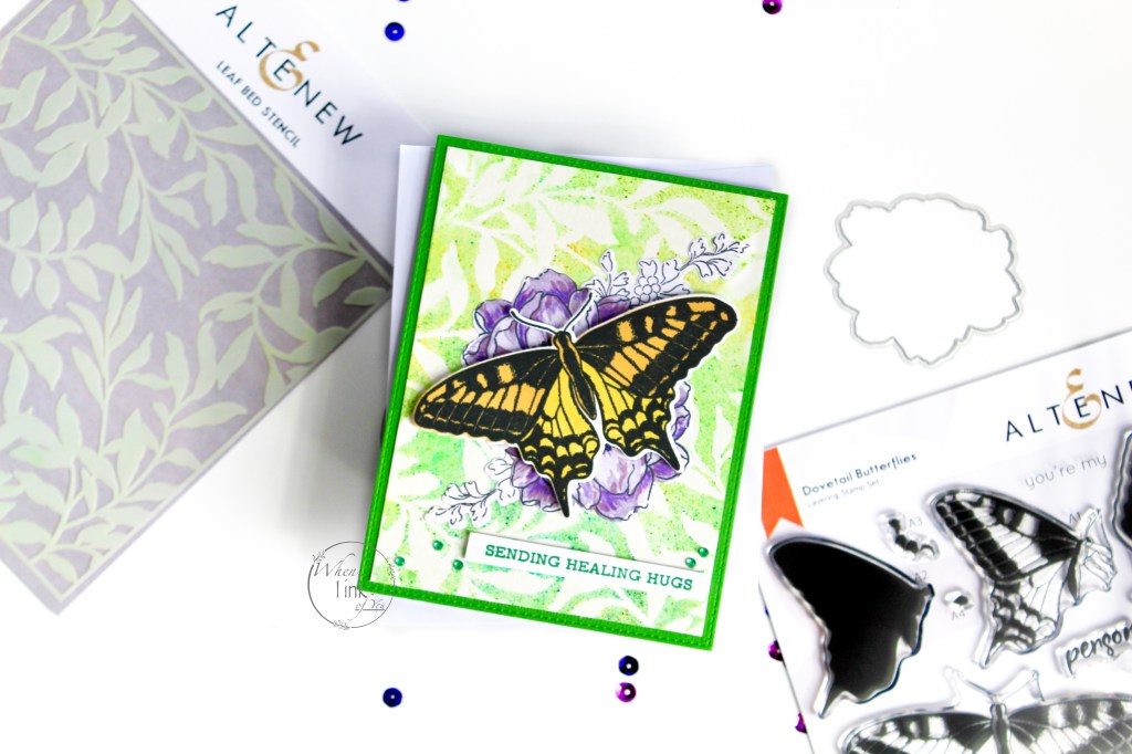 For card centerpiece, I used Altenew’s Beautiful Day Stamp and Die set (a favorite of mine) and the SugarPlums Oval Dyes Ink set. The butterfly was created with Dovetail Butterflies Layered Stamp Set and Dies and Drew Drop Memento Inks in Dandelion and Cantaloupe. The sentiment is from Sentiment Strips 2.